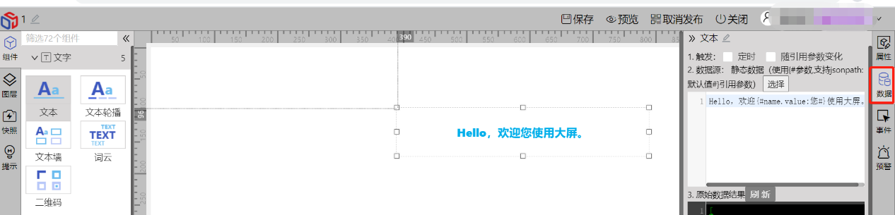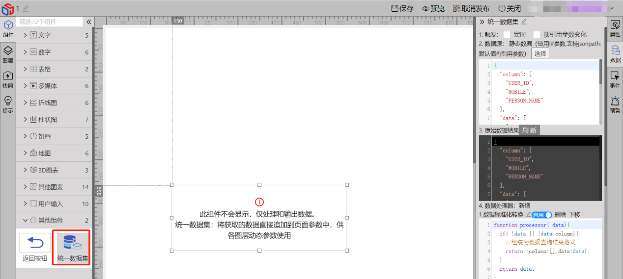 拉取组件(其他组件-统一数据集)-选择数据-选择数据源-刷新获得数据