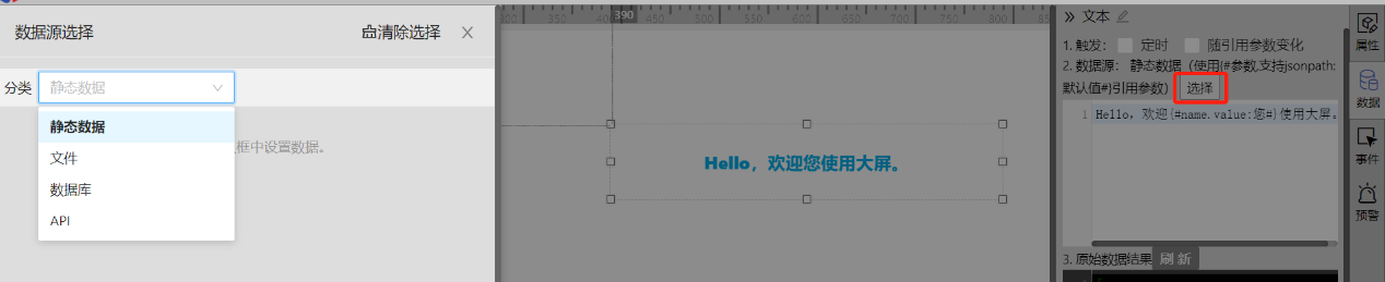 点击数据源“选择”按钮,左边会弹出选择数据源大类