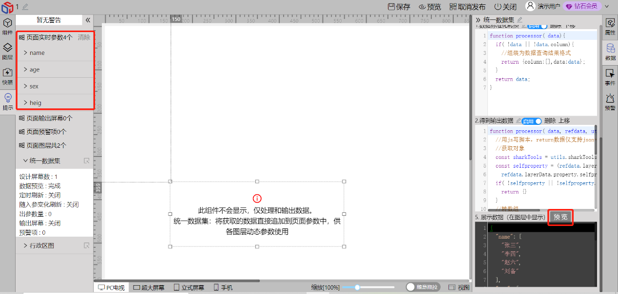 通过使用页面数据的value值,数据就可以在其他组件上使用,而不用在另外绑定数据源,当前页面的数据集组件也会隐藏在页面。