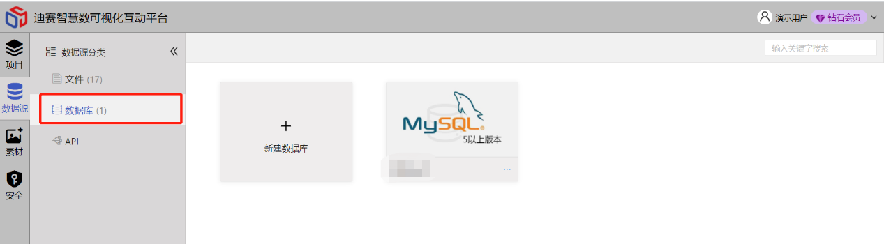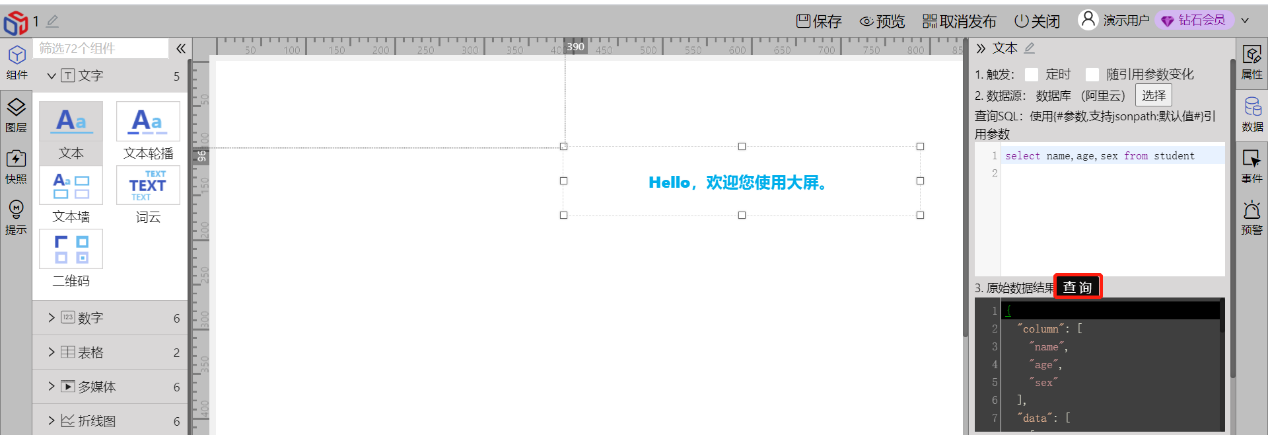 选择绑定数据源,输入数据源参数,及数据库数据源输入查询数据条件,API数据源输入接口参数(json格式),文件数据源,根据文件,sqlite文件和excel均可输入sql支持查询语句来获取数据,如下示例为mysql数据库获取数据: