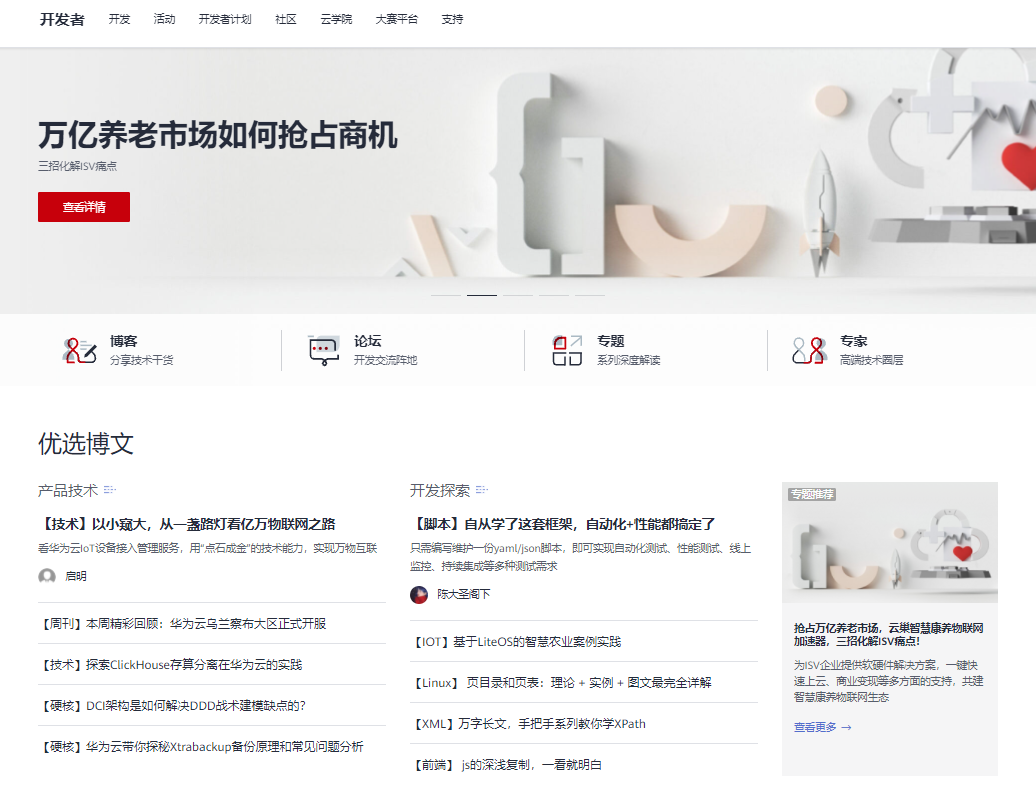 例如【优质博文】版块,按照文章类型划分,推荐内容每日更新,保证内容的新鲜度与质量。【热门论坛】版块,精选AI、物联网、大数据等热门技术领域,为大家在首页呈现当日最新最热的的技术交流。【专家风采】栏目,也邀请各位业界专家分享与华为云的故事,共话技术哲思。