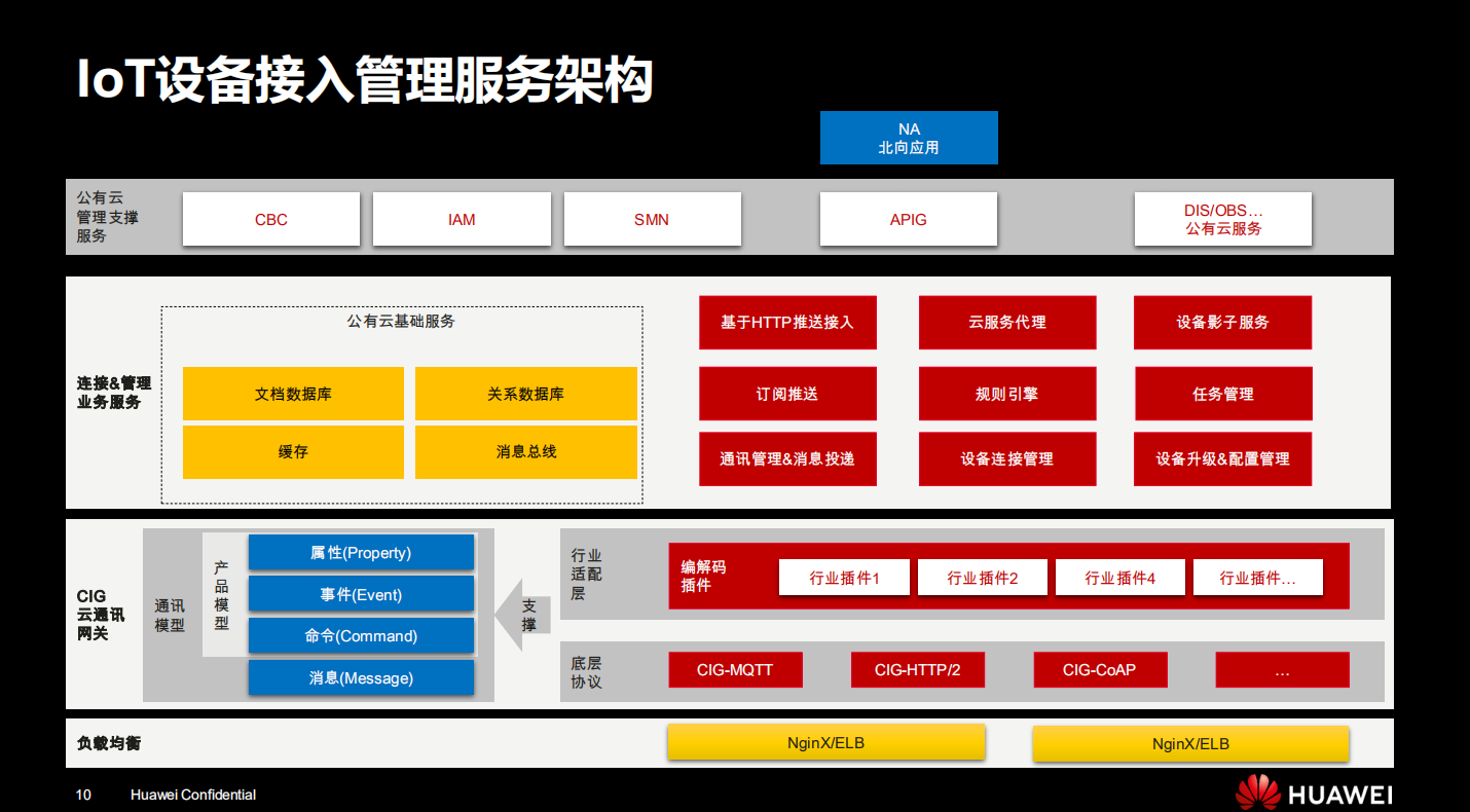 这样的好处是任何一个服务实例出现问题的时候,都可以通过创建服务来保证业务的无损。同时在海量并发的情况下,通过弹性伸缩扩容,能够使服务满足对应的业务需求。在无状态的框架之下,又分为两层:CIG云通讯网关层,这层正如前文所说,作用是将各种设备和协议、不同的数据格式,转换成统一的模型,进而到上层由业务服务去处理。同时在最上层,基于公有云的管理支撑服务,诸如CBC、IAM以及SMN(消息通知服务)等,整体构建出设备接入管理服务。至此,这是华为云IoT服务内部的业务逻辑,有助于理解后续的实验过程。