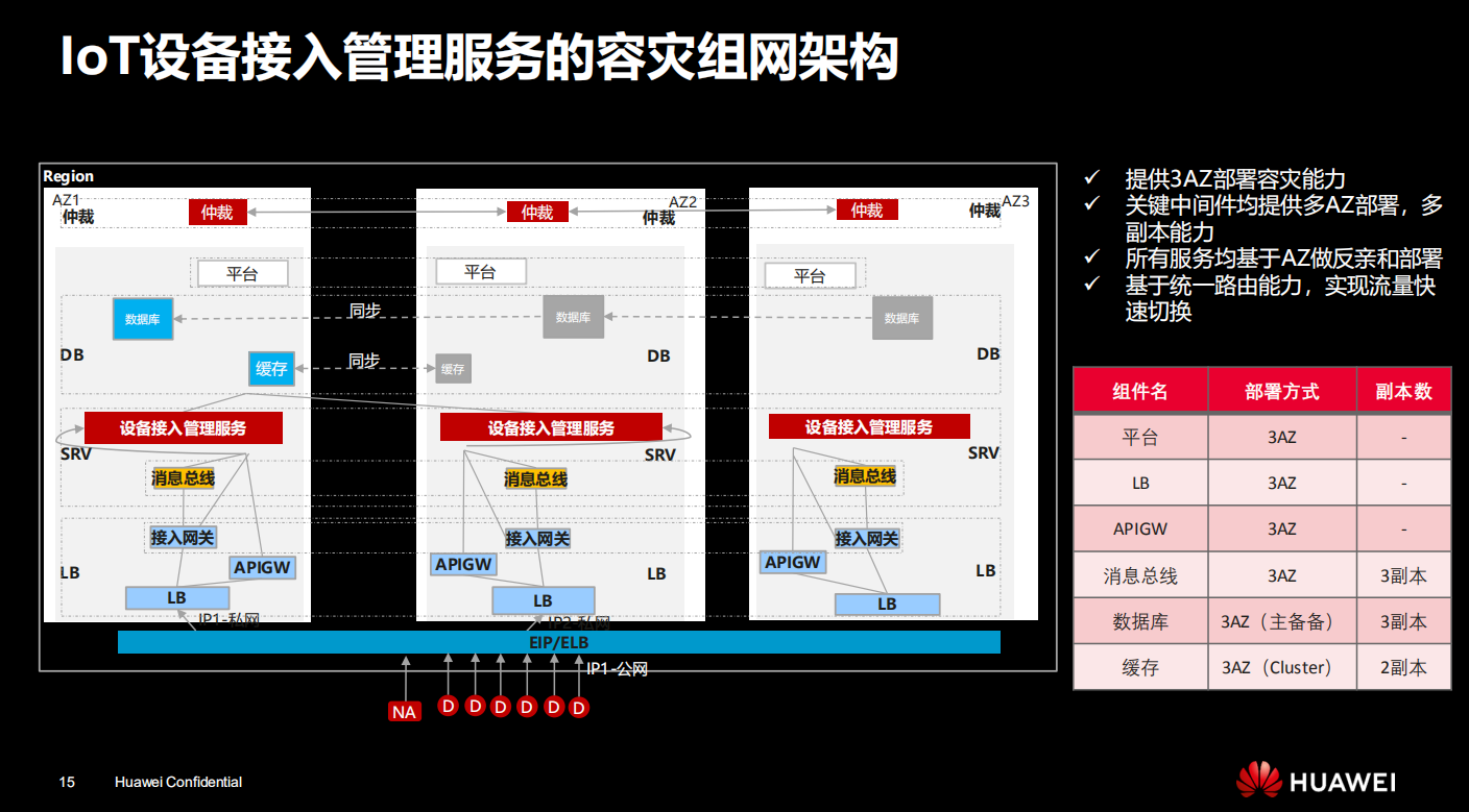 传统性容灾和云服务的容灾有很大程度上的变化,以前做传统服务,都是尽量希望避免不出错。但是在云服务上,设备不是专业的设备,为了降低成本,也不会做大成本的容灾组网设备投入。我们华为云loT设备提供3AZ部署容灾能力;关键中间件均提供多AZ部署,多副本能力;所有服务均基于AZ做反亲和部署基于统一路由能力,实现流量快速切换。