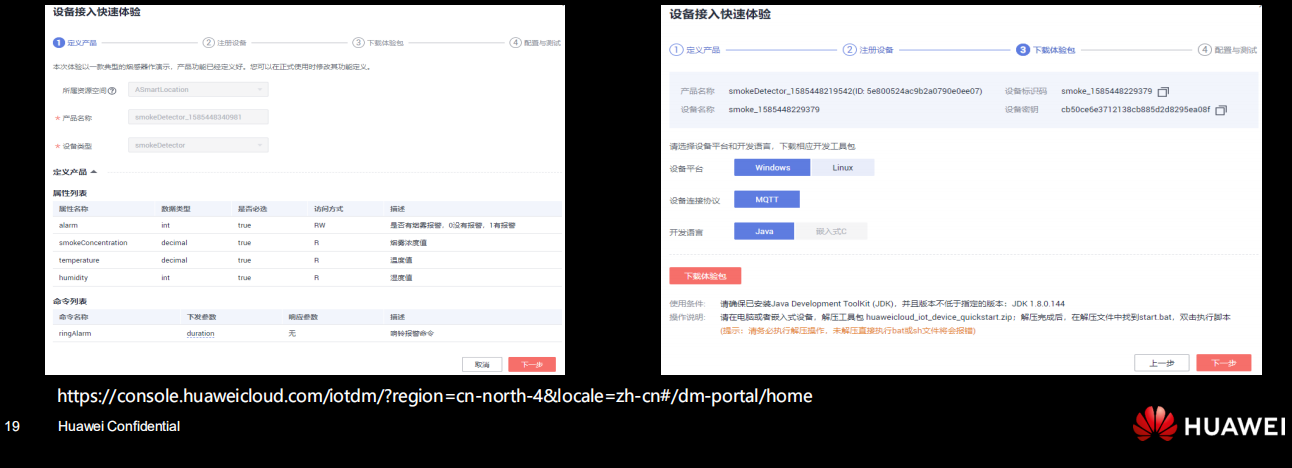 模拟烟感(带有烟感器)的设备接入平台,产品已经定义好,可以直接进行使用;注册设备时可以使用默认的标识码和相应名称;下载开发工具包时,直接下载体验包即可,设备平台可以是Windows(开发语言:java)也可以是Linux(开发语言:嵌入式C),连接协议是MQTT。