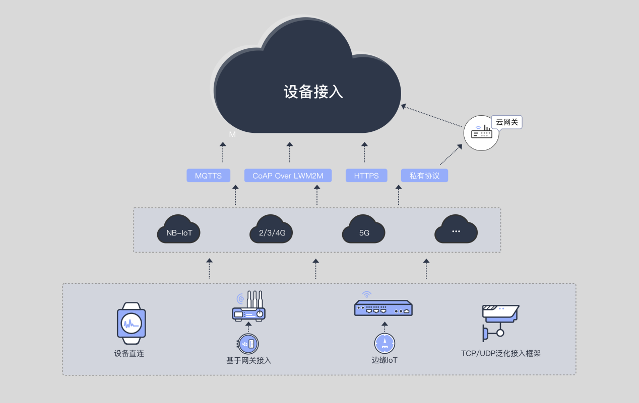• 设备可以通过固网、2G/3G/4G/5G、NB-IoT、Wifi等多种网络接入物联网平台,并使用LWM2M/CoAP或MQTT协议将业务数据上报到平台,平台也可以将控制命令下发给设备。