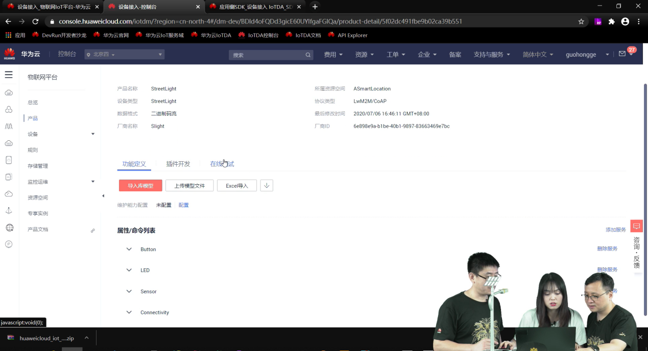 产品管理:产品是指具体的设备类型,不同的设备类型和型号对应不同产品,华为云IoT设备接入通过物模型的方式来表达一款产品,通过这种方式定义设备的属性、支持的功能以及对应的通讯方式、通讯模型、通讯原语等;