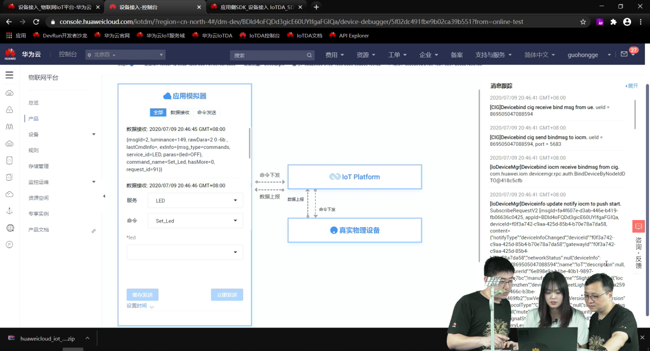 示例代码实现端云双向通信 说该章节适合开发人员,您可以下载样例代码或者自行开发,将代码放在您的真实设备或者在windows/Linux个人计算机上模拟真实设备进行运行,完成设备接入的基本流程,同时能了解规则引擎、AMQP推送等高阶功能。