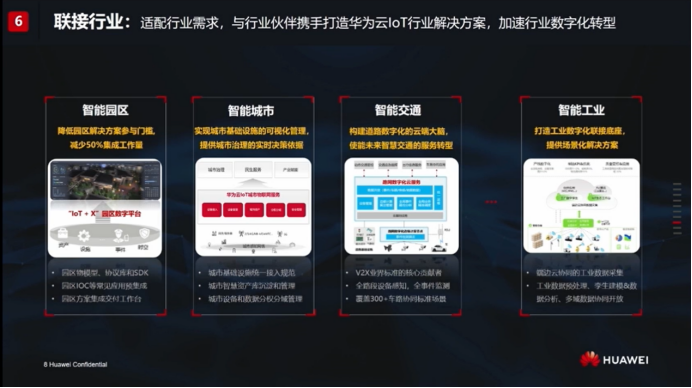 顺应行业趋势,华为云IoT将聚焦物联网技术和商业基础能力建设,三个联接具体来说,就是联接设备,联接生态伙伴,最终服务联接各个行业,打造出物联网行业解决方案,帮助各行各业做好数字化转型。