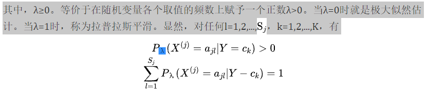 用极大似然估计可能会出现所要估计的概率值为0的情况。这时会影响到后验概率的计算结果,使分类产生偏差。解决这一问题的方法是采用贝叶斯估计。具体地,条件概率的贝叶斯估计是