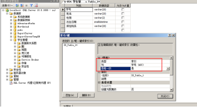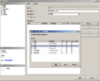 设置列属性(列约束),主关键字约束,唯一性约束,先把学生表的学号设置为主键,将学生表的学号属性索引设置唯一性;把学生的性别默认设置为男,如下图所示