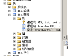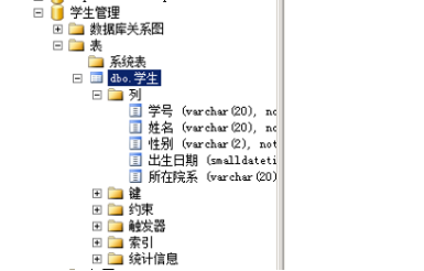 在对象资源管理器中查看所建的表,选中“学生管理”数据库,双击~表"对象,找到“学生”表,展开“学生”表,打开列选项,如上图所示。