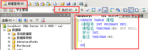 在对象资源管理器中,展开“数据库”,选中“学生管理"数据库,右击,在弹出的快捷菜单中选择“新建查询”选项,打开查询编辑器,输入以下SQL代码。如图可见创建成功了:
