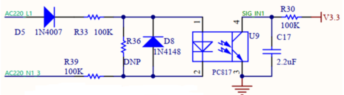 1) 当220V断开时,光耦不导通,SIG_IN1为高电平 这样就实现了在220V断开时单片机检测为高电平,在220V导通时单片机检测为低电平的逻辑。