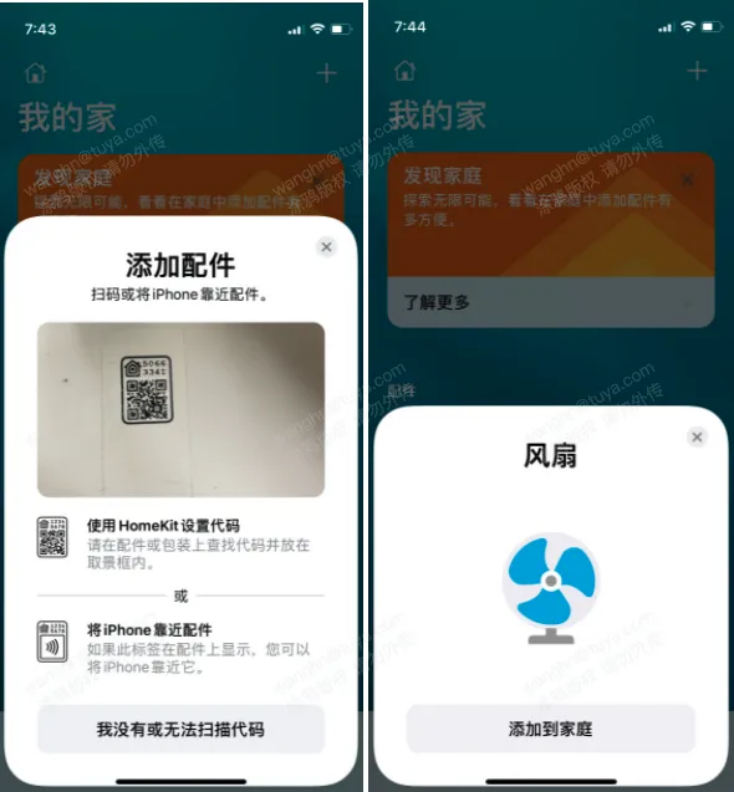 1.每个支持 HomeKit 的设备都有一个设置代码,设备是通过设置代码进行配网。首先将设备重置,进入配网状态,然后打开苹果手机上的 Home App,点击【添加配件】,可以选择扫描设置代码的二维码或者手动输入8位的设置代码, Home App 会搜索附近的设备,添加成功,并显示对应的品类。