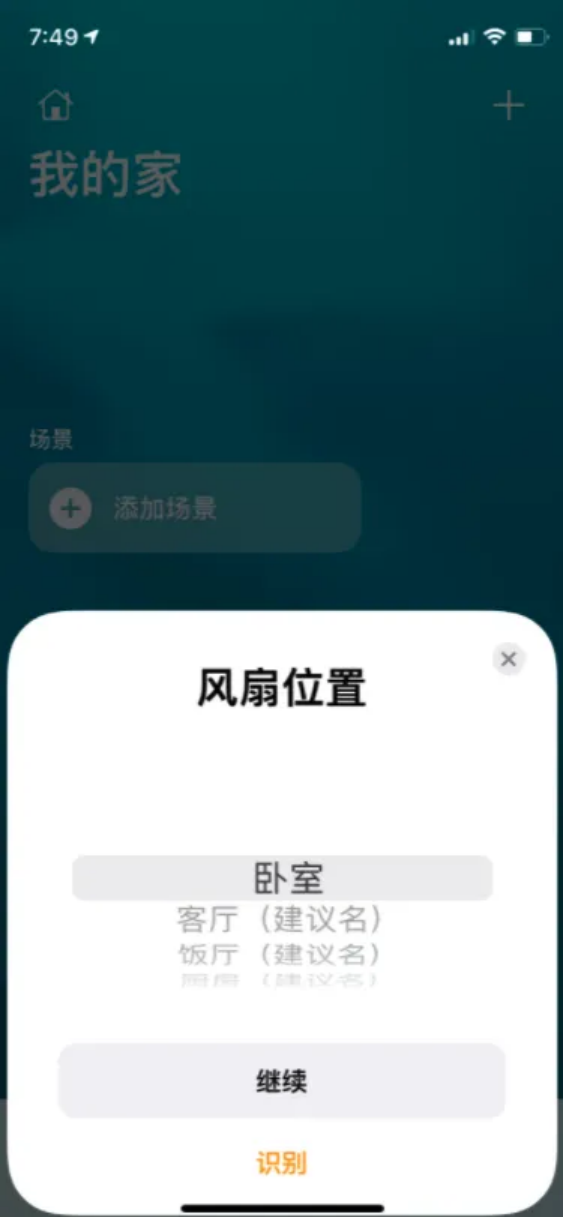 2.将设备【添加到家庭】,选择对应的家庭位置,如卧室。点击【继续】后,就添加设备成功了,开发者就可以用 Home App 来测试产品的 HomeKit 功能。