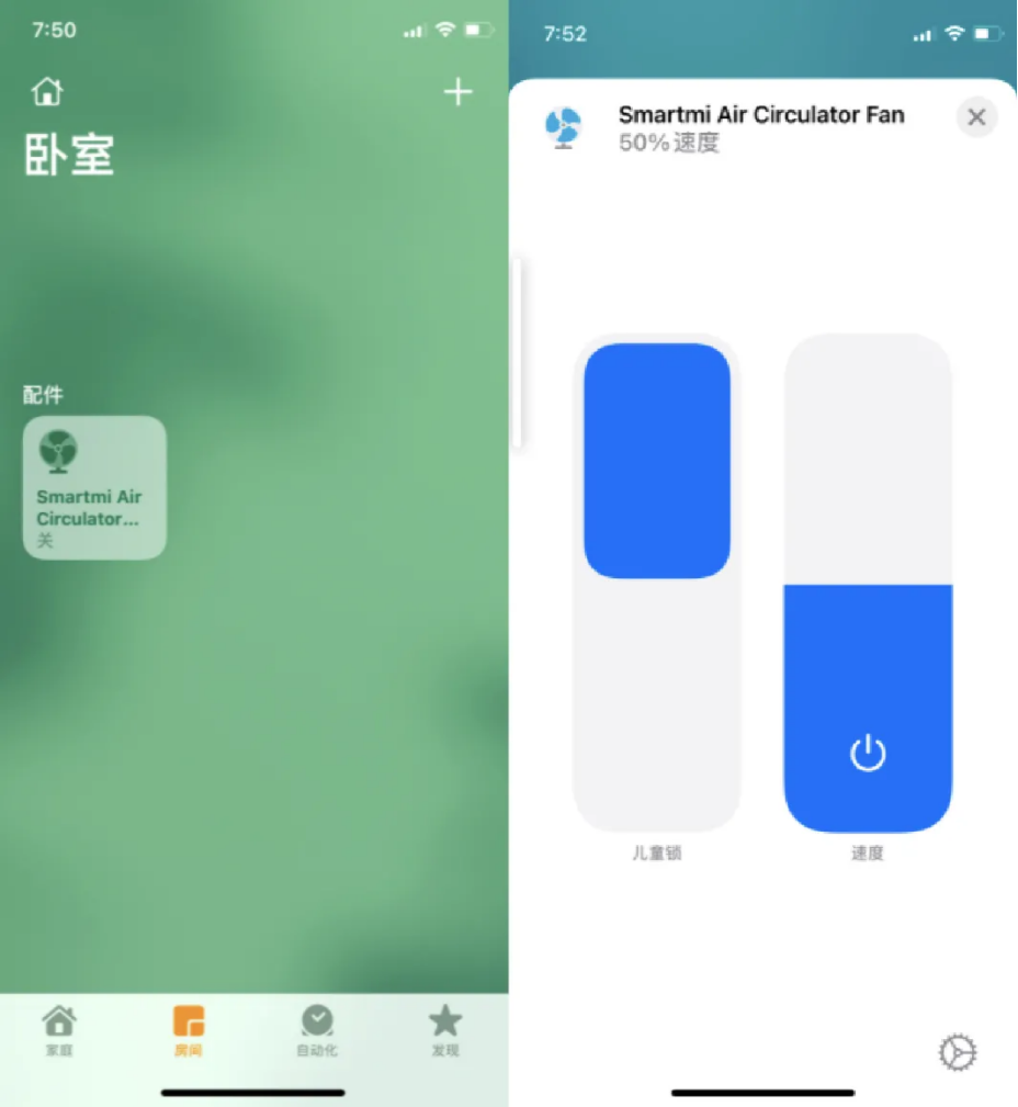 3.可以进入【家庭】页面,长按【配件】, Home App 会自动进入设备控制页面,如图中风扇的控制功能:风扇风速的调整,儿童锁的控制。