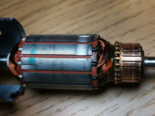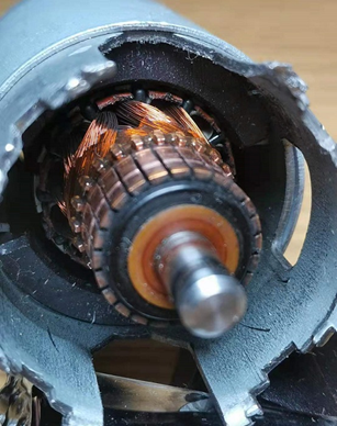 再看一个电极数比较多的直流电机,这是我们在另一篇讲豆浆机的原理的文章中提到过的电机,虽然豆浆机是 220 交流供电,但里面用的这个电机却是直流电机。220V 交流经过整流后变为直流电,直接通过碳刷加到电机的线圈上,它的电极数多,所以扭矩也大。