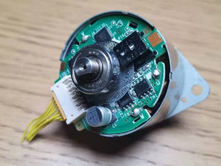 采用矢量控制的永磁同步电机转矩脉动很小,转动平稳,在低速下也能输出大力矩。而直流无刷电机控制简单,成本更低。下图为一个带有磁编码器的永磁同步电机。更高端一些的电机大多采用光电编码器,可以以更高的精度输出转子的位置,从而控制器可以更精确的控制转子的转动。