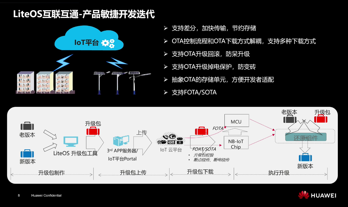 支持差分升级(必须基于某个版本),优点是可以加快传输速度(比较小传输快),并且可以节约存储降低功耗,适用于对改动比较小,比如修复缺陷或者小功能推送等小版本的省级。(制作升级包,将包传送到云平台,下载后将包推送到设备端,最后设备端进行升级)。