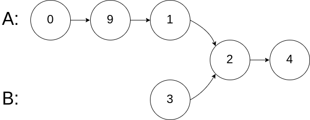 输入:intersectVal = 2, listA = [0,9,1,2,4], listB = [3,2,4], skipA = 3, skipB = 1 输出:Intersected at '2' 解释:相交节点的值为 2 (注意,如果两个链表相交则不能为 0)。 从各自的表头开始算起,链表 A 为 [0,9,1,2,4],链表 B 为 [3,2,4]。 在 A 中,相交节点前有 3 个节点;在 B 中,相交节点前有 1 个节点。