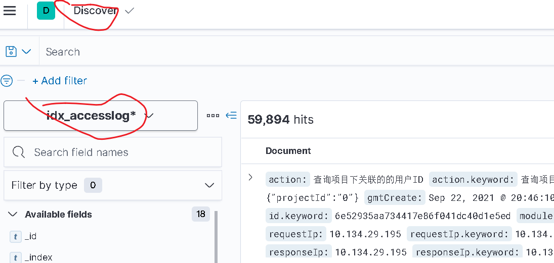 - 然后转到discover栏目查看存入elasticsearch的数据