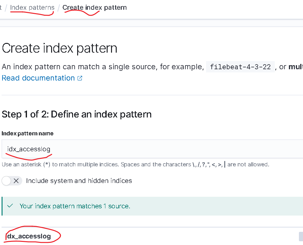 - 转到 Index Patterns->Create index pattern 栏目下,在Index pattern name中输入idx_accesslog,只要匹配到在elasticsearch中创建的索引即可