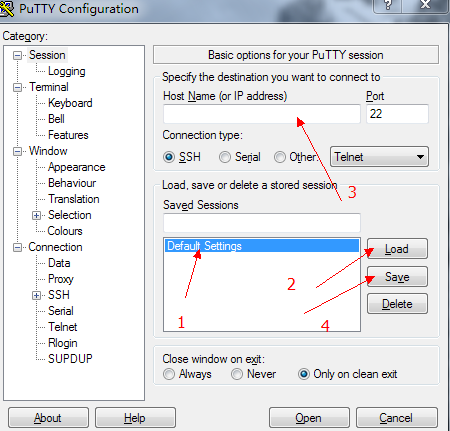 依次点击1, 点击默认设置 2, 加载设置 3, 在Host Name中输入远程Linux的IP地址 4, 保存设置