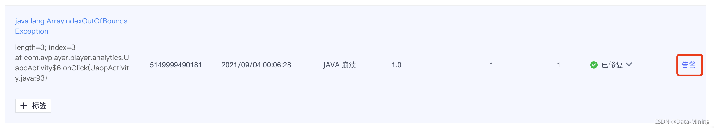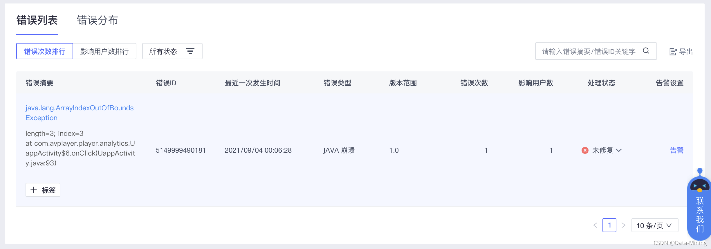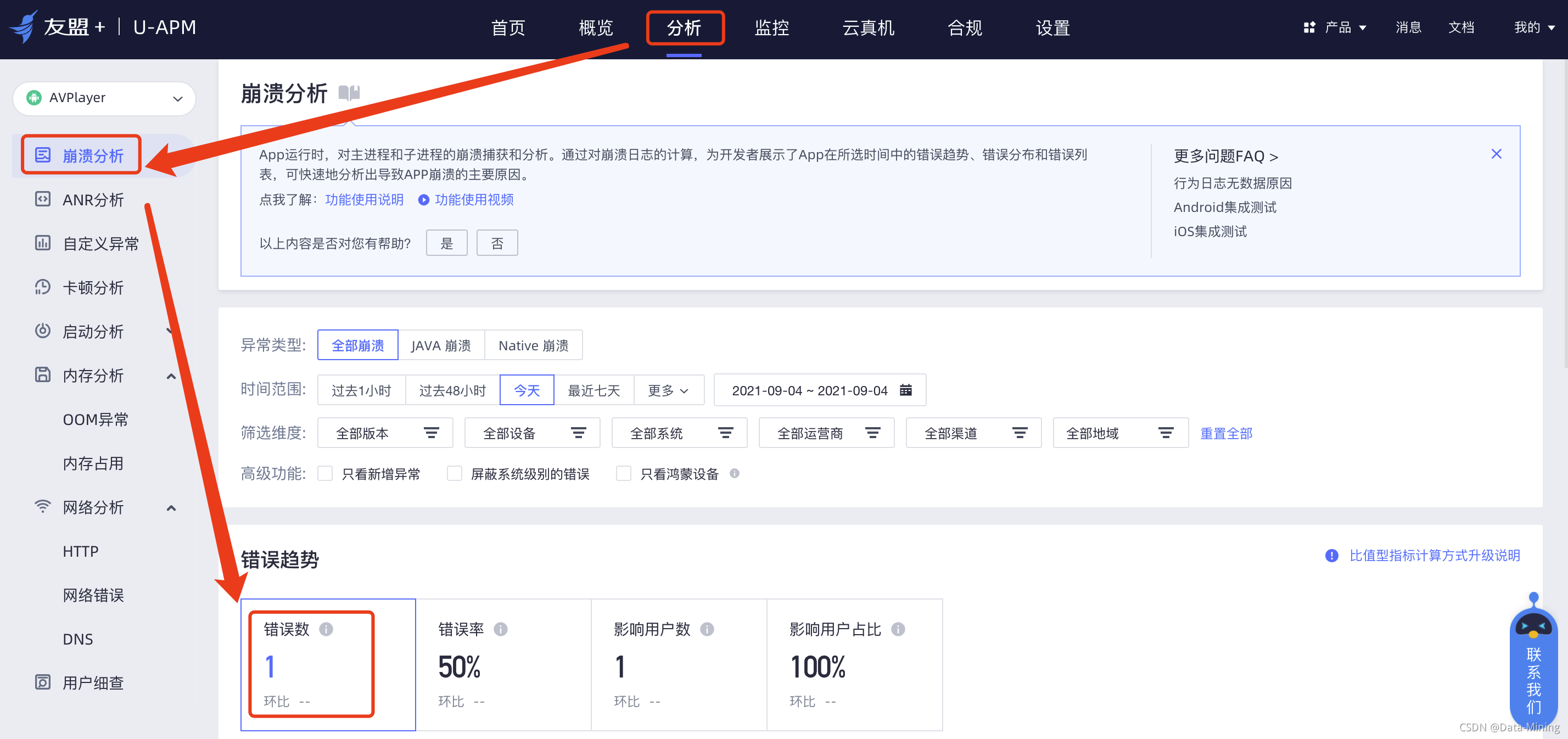通过后台的“分析”页签,找到“崩溃分析”模块,可以发现今天有一例崩溃错误。