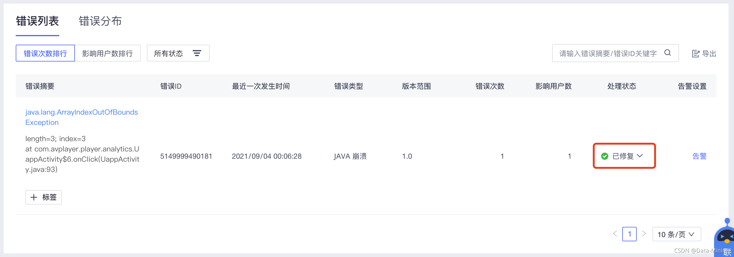 在当前页面往下划,我们可以看到相应的错误列表和错误分布。其中,错误列表包含了错误发生的摘要、ID、最近一次的发生时间、错误类型、版本范围、错误次数、影响用户数、处理状态等,具体内容如下图所示: