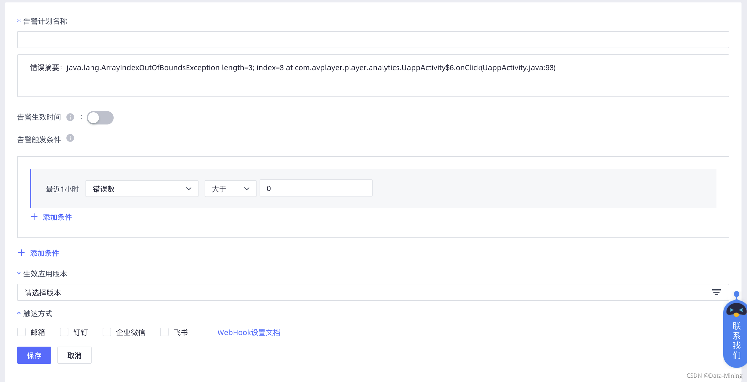 另外,还可以自定义告警触发条件,一般都是错误发生次数大于 0 时就会生效。还可以指定生效的应用版本,比如我只想监控 APP 应用最新的 3.0 版本,就从下拉列表中选择对应的版本即可。通知方式可以选择邮箱、钉钉、企业微信、飞书中的至少一种,常见的方式是前两种。