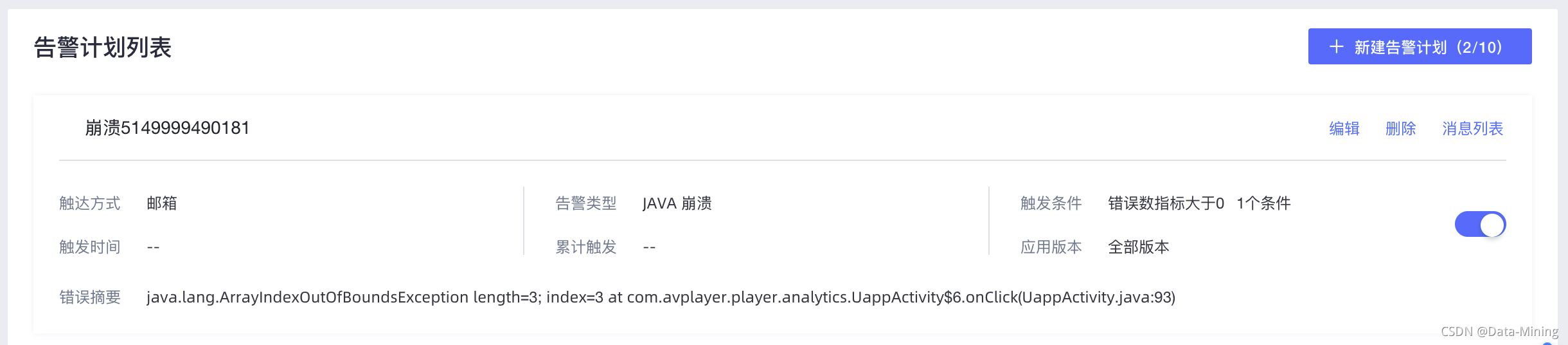 另外,我们还可以针对某种错误类型设置告警策略,比如上面的崩溃问题,如果我们不确定是否真正解决了。那么就可以点击“告警”按钮,进入告警策略设置页面。