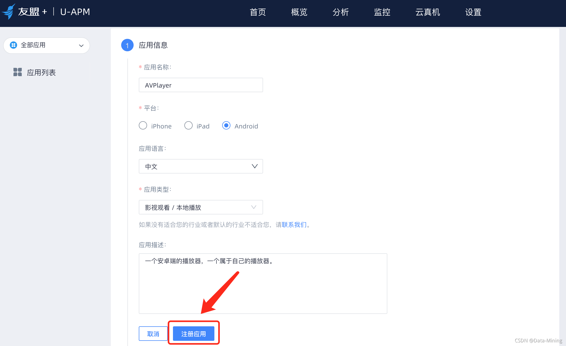 进入创建应用界面,首先填写应用名称 AVPlayer,然后选择平台,这里需要注意的是友盟支持iPhone、iPad、Android三个移动终端平台,我们选择安卓,默认中文为应用语言。我们的应用程序是一款播放器,因此应用类型选择影视观看/本地播放。最后,填写应用程序的基本描述信息,点击“注册应用”按钮。