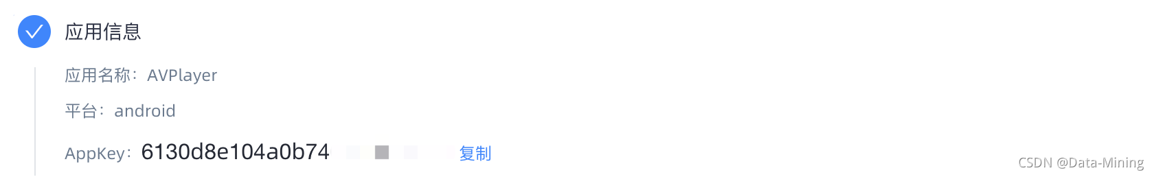 完成注册后,系统会给出应用程序的AppKey,为了保密,截图中隐藏了部分内容,请见谅。