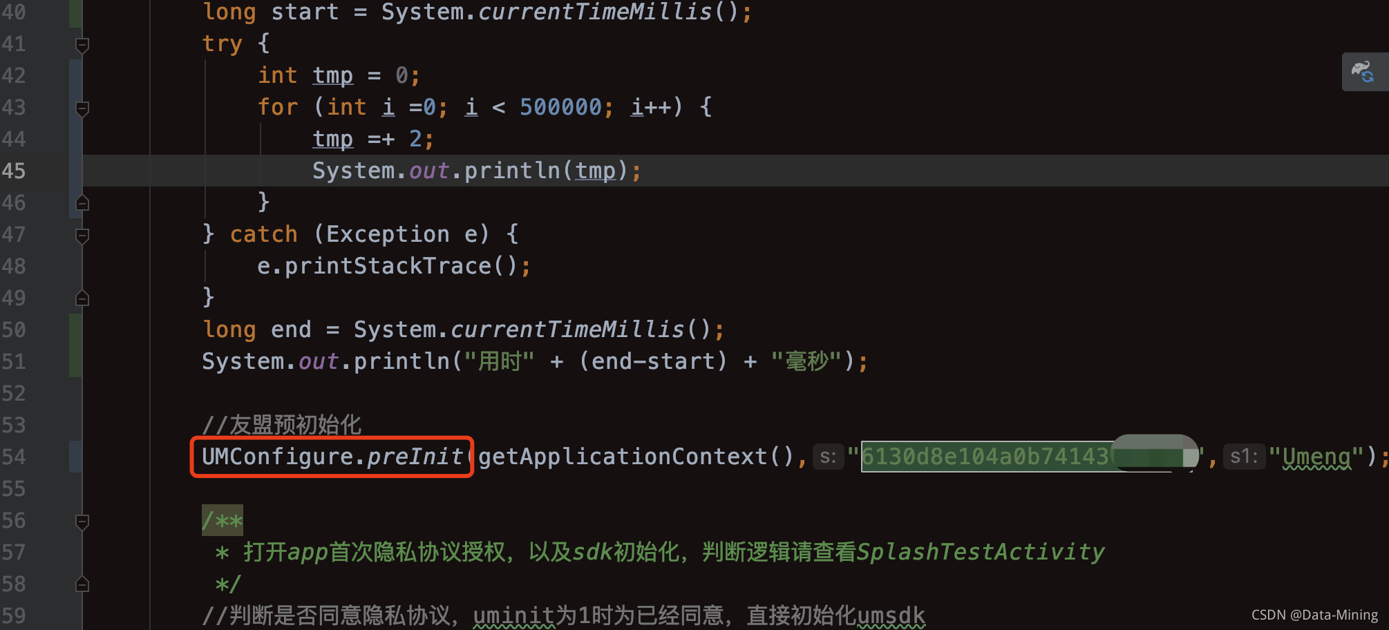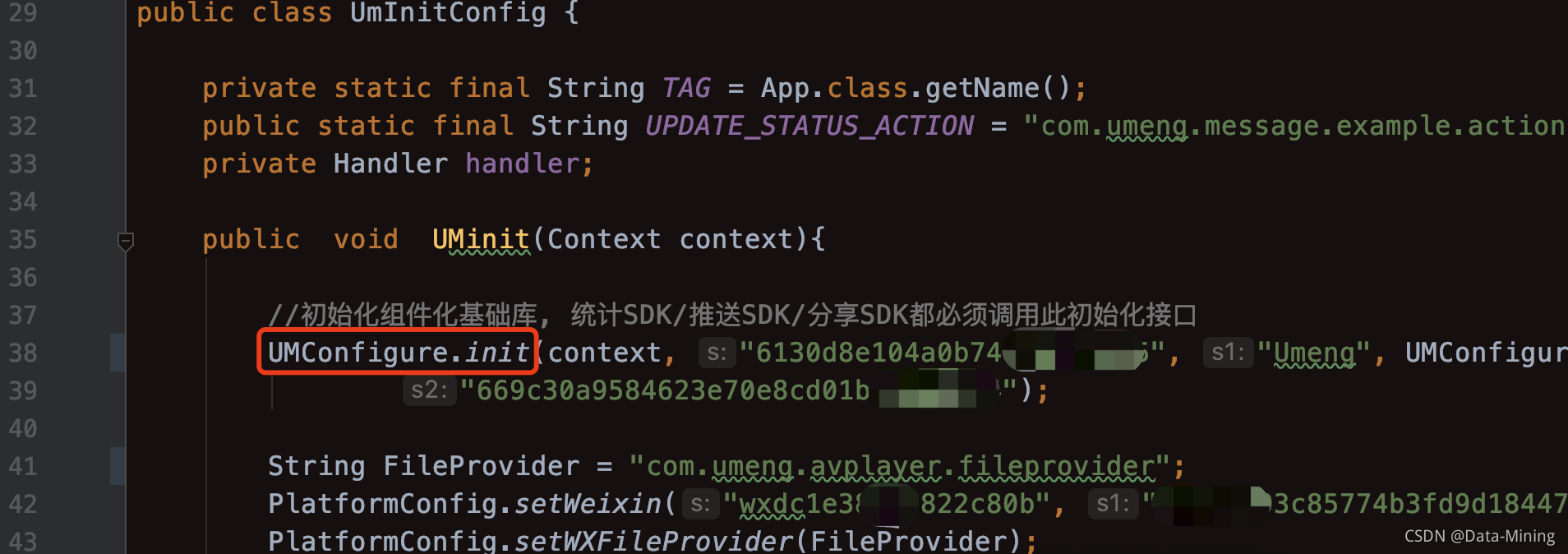 敏感的小伙伴,在这里就立马会提出一个疑问:调用友盟的这个方法会不会影响APP的移动速度?答案是多虑了。preInit() 作为预初始化函数,耗时极少,不会影响App首次冷启动的用户体验,不会采集设备信息,也不会向友盟后台上报数据。