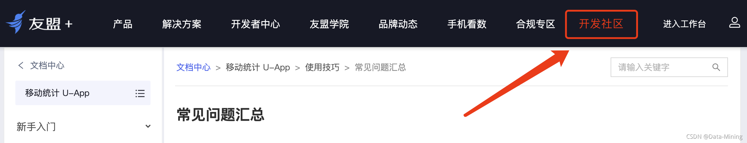 个人感觉,这是最常见的一种错误,但是官方的文档中居然没有相关的说明。官方常见问题列表地址:https://developer.umeng.com/docs/119267/detail/181401 ,感觉其中很多内容都是官方自己总结的,不够接地气,比如这个错误就不知道应该归到哪一类。官方是不是可以考虑增加一个社区模块,方便开发者之间交流。具体位置可以参考下图: