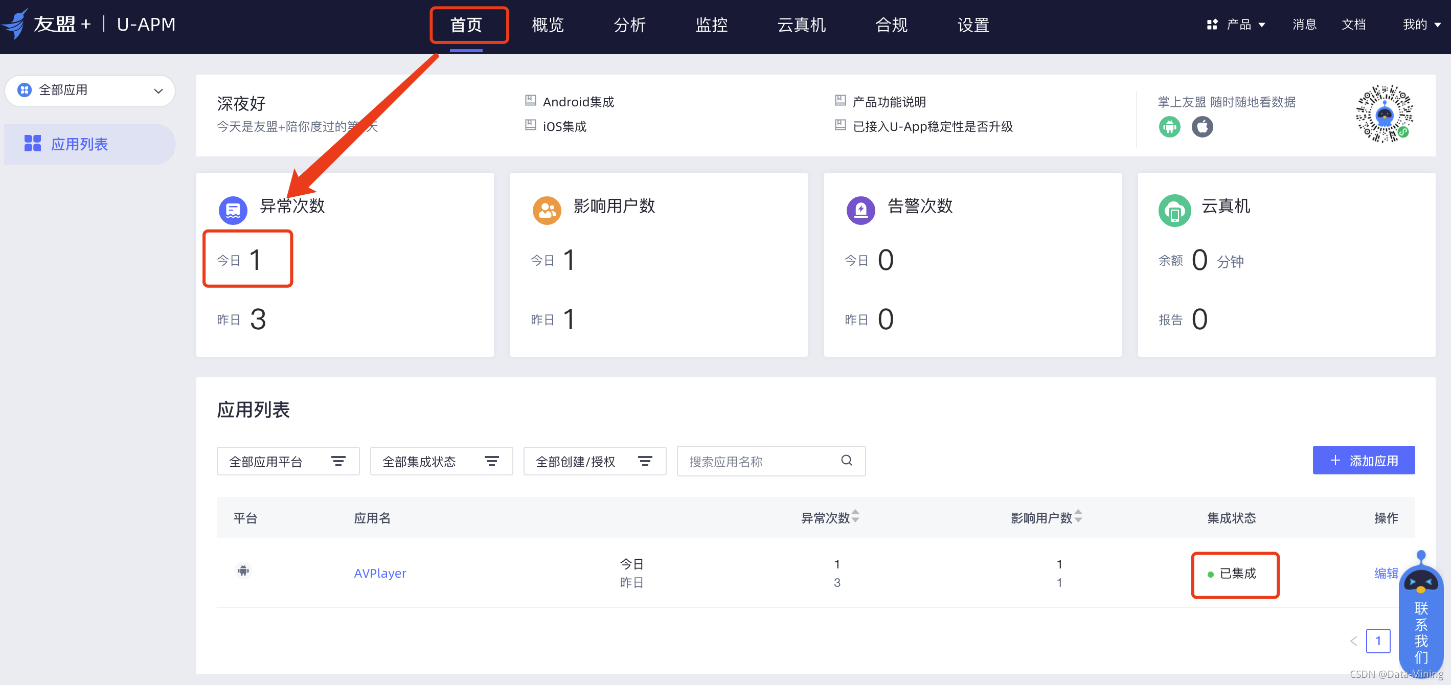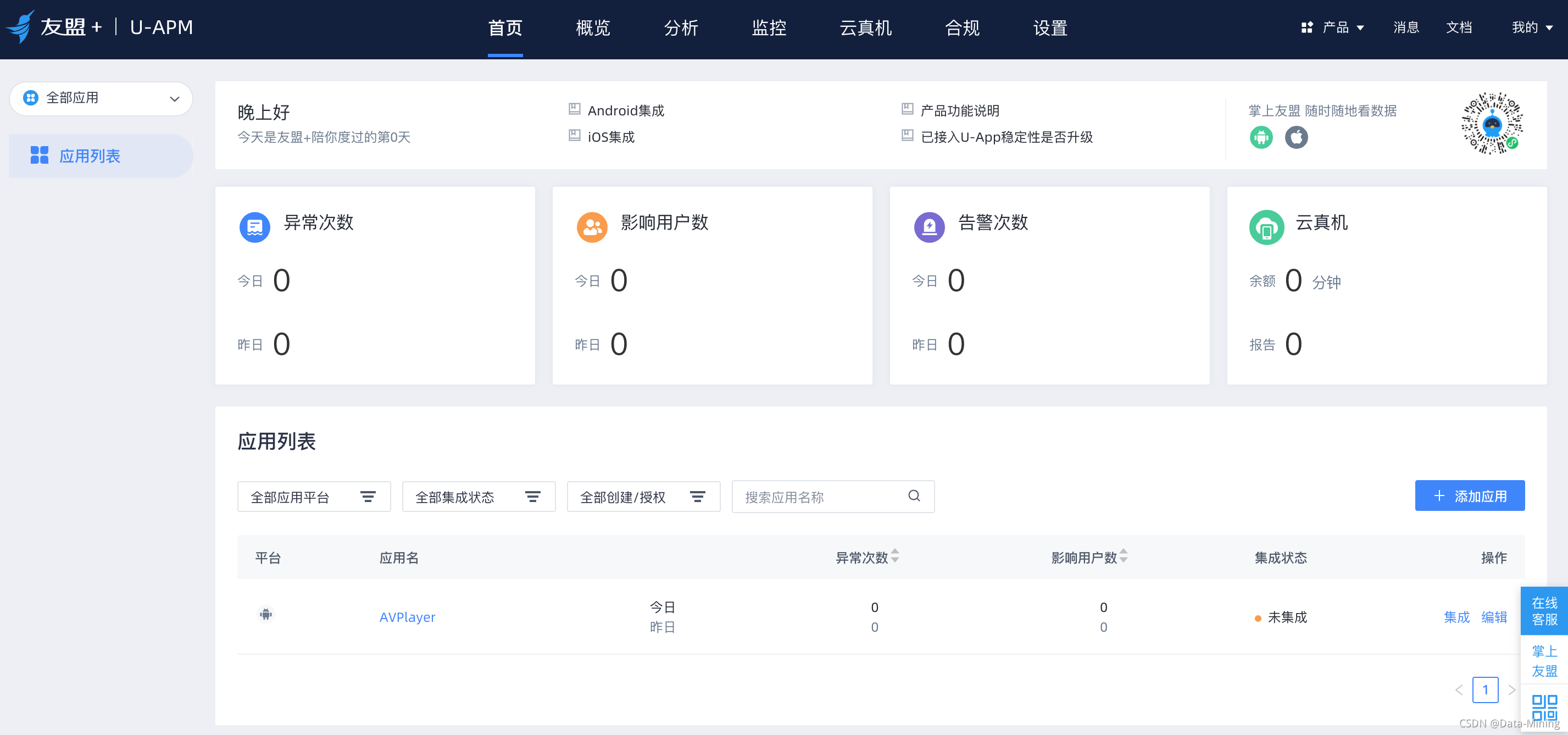 我们完成友盟 SDK 集成后,就可以通过后台首页发现对应的应用名称集成状态显示“已集成”。同时,我们还可以查看应用程序的运行状态,比如异常次数和影响用户数。