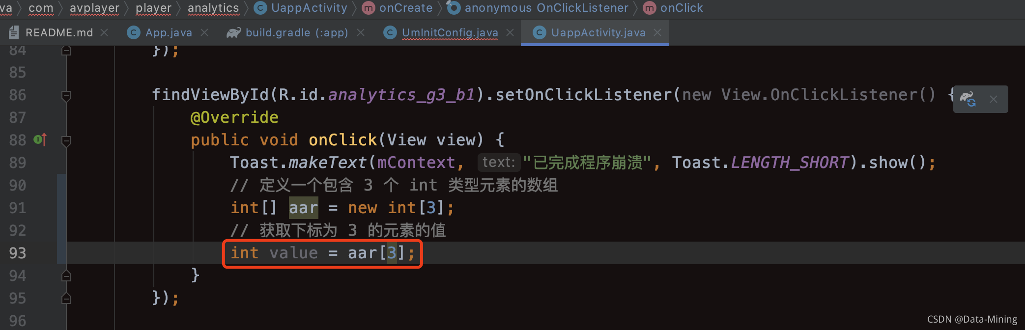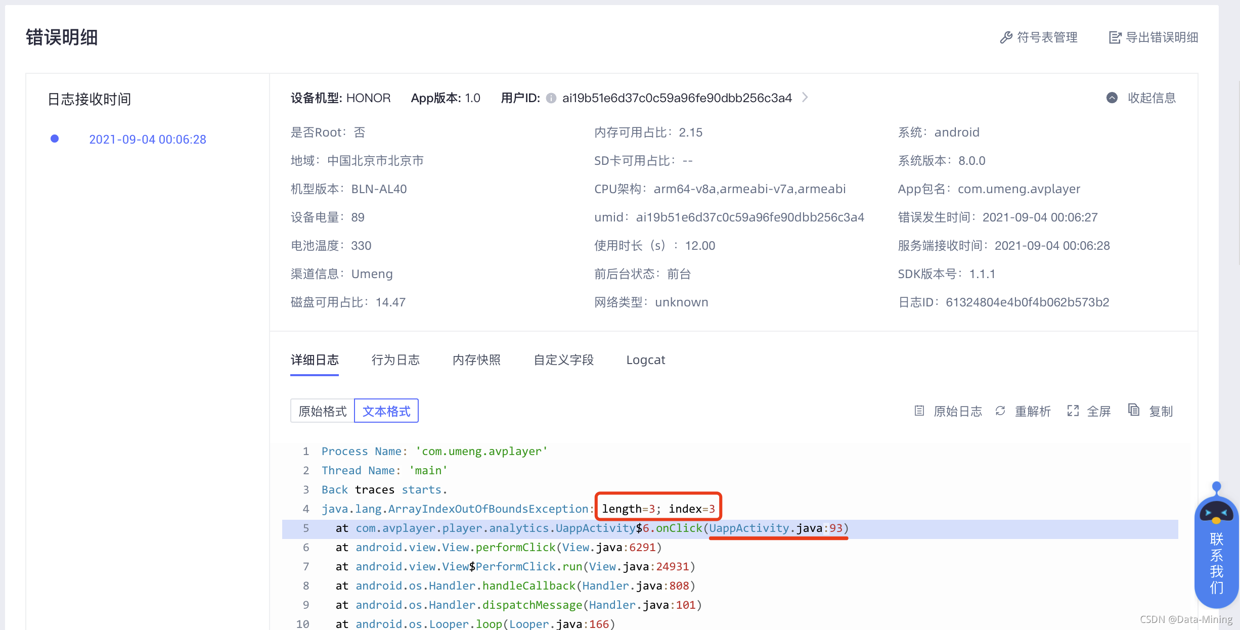 好了,接下来,我们具体分析一下这个错误。点击错误列表中错误摘要的链接进入错误详情,里边有错误的具体明细,比如下图所显示的错误原因是数组越界:ArrayIndexOutOfBoundsException,具体的代码位置在文件 UappActivity.java 的第 93 行。