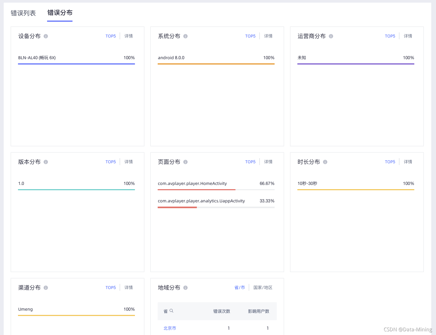 错误分布包含了设备分布、系统分布、运营商分布、版本分布、页面分布、时长分布、渠道分布、地域分布,具体内容如下图所示: