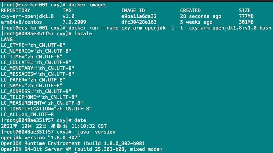 $ docker run --name cxy-arm-openjdk -i -t cxy-arm-openjdk1.8:v1.0 bash