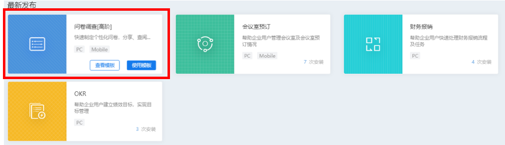 “问卷调查”项上有两个功能,“查看模板”和“使用模板”。
