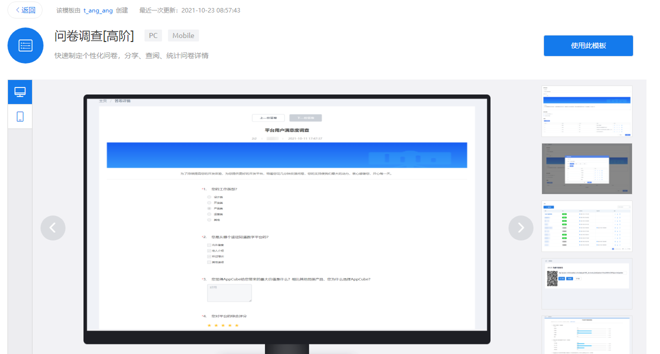 点击 “查看模板” 进入问卷调查模板页面,这里将看到电脑和手机界面的问卷调查分享、查阅、统计问卷的详情模版。