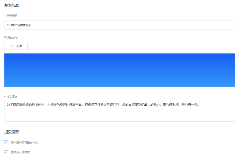 点击“创建问卷”后进入到“基本信息”项,填写<问卷标题><问卷描述>相关信息。