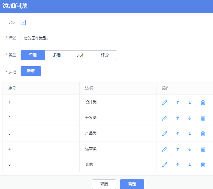 在问题项点击“添加问题”可以增加,删除和编辑问卷问题的类型和问题内容。
