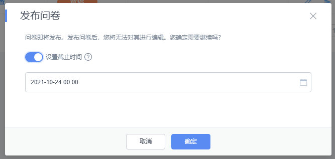 问卷发布后,将无法编辑问卷内容,并提供问设置问卷截止时间。
