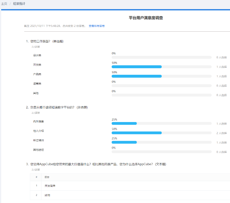 点击“结果统计”,“结果统计”页面提供问卷调查统计结果