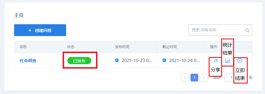 自动返回主页面,问卷调查状态显示 “已发布”,操作拦提供<分享><结果统计><立即结束>操作。