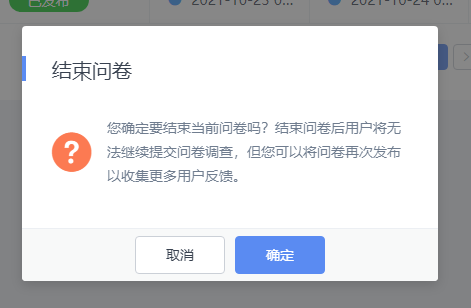 点击“结速问卷”会提示时否结束当前问卷,结束后可以再次发布以收集更多的反馈。