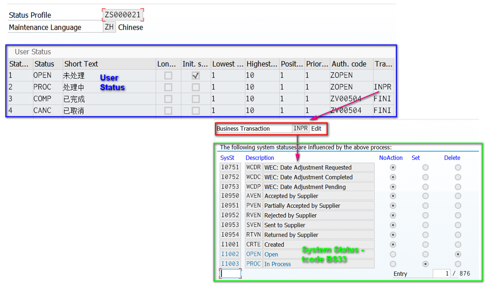 有朋友问到User Status profile中Business Transaction字段的用途,如下图INPR, FINI所示。