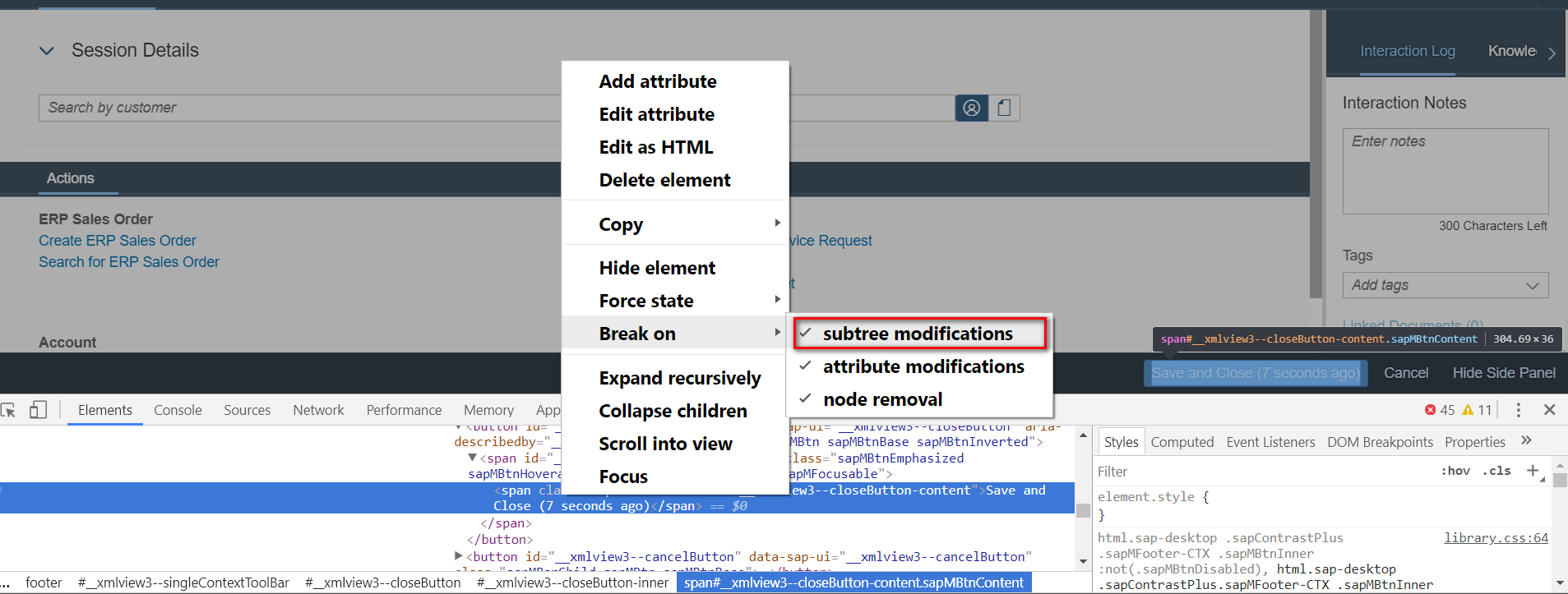 2. 右键单击该标签,选择Break on->subtree modification: