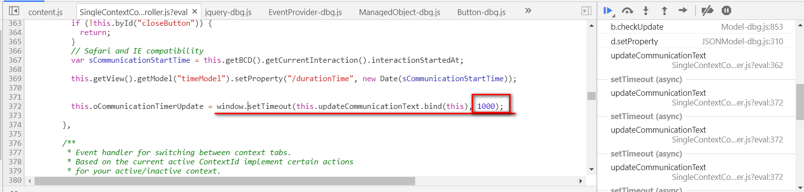 从调用栈也能迅速找到setTimeout的调用位置和调用间隔(1秒)